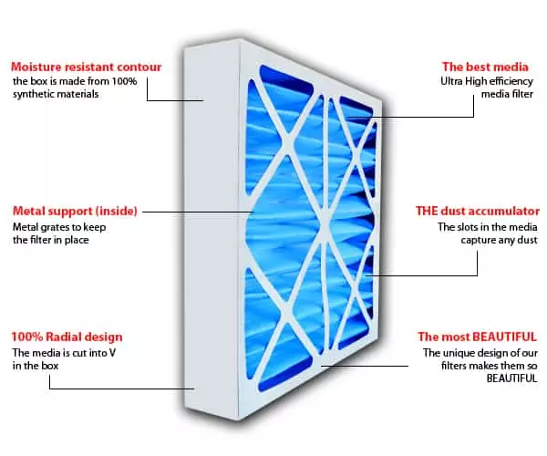 Ce filtre est fait à 100% de papier recyclé, il a été spécialement conçu pour rencontrer la norme des bâtiments verts (LEED). Le média du filtre à air est collé sur une grille métallique du côté de l’air sortant, ce qui empêche le flottement tout en gardant l’uniformité du filtre et des plis. Le filtre est introduit dans une boite en carton qui est à l’épreuve de toute forme d’humidité et c’est ce qui rend leur conception si unique. Les supports du filtre sont intégrés sur l’armature du filtre, le média est ensuite collé sur chaque partie de l’armature, empêchant ainsi n’importe quelle possibilité de fuite d’air. Les filtres à air de capacité MERV 13 sont fabriqués avec des matériaux 100% recyclés et ils sont conformes à la norme ASHRAE 52.2.